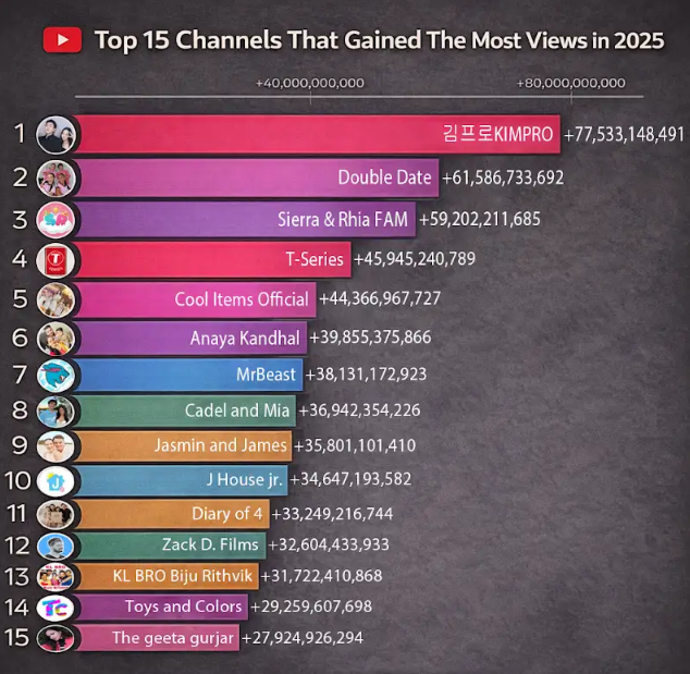 2026년 1월 7일 유튜브 분석 사이트 플레이보드가 발표한 2025년 연간 조회수 순위에서 김프로 채널이 775억 회로 전 세계 1위를 차지했다. 김프로는 2위 '더블데이트'(615억회)를 160억회 앞지르며, 미스터비스트(381억회)의 2배를 기록하는 압도적 성과를 거뒀다. 채널 커뮤니티에 "전적으로 여러분 덕분"이라며 감사 인사를 전한 김프로는 2026년 더 발전된 콘텐츠로 보답하겠다고 밝혔다. 이 기록은 국내 유튜버로는 사상 처음이며, 2025 서울콘 에이판 스타 어워즈 글로벌 인플루언서상 수상으로 이어졌다. 김프로의 성공은 한국 숏폼 콘텐츠의 글로벌 위상을 입증한 상징적 사건이다.